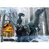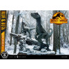 In this impressive and quaint diorama from the blockbuster movie, the highly intelligent Velociraptor Blue, named for the tell-tale, unique blue stripe along her body, stops in a North American forest to survey her surroundings with her baby, Beta. The calm, snowy terrain is in bright contrast to the alert, reptilian creatures it contains. Here we see Beta observing her mother carefully...for cues on how to behave and how to regard the unfamiliar environment.