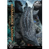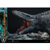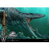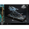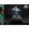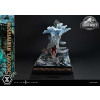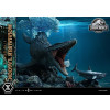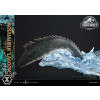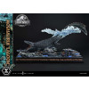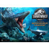 The specially designed base illustrates the ecosystem of the lagoon in striking detail: red and blue corals, schools of fish swimming alongside the predator, and a great white shark fleeing in desperation. The Jurassic World title logo on the front completes the display, drawing viewers into the film’s world.