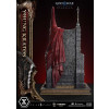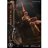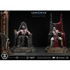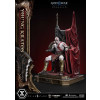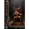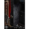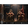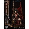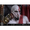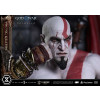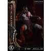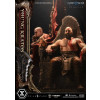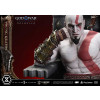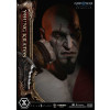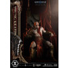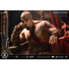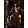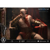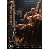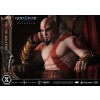 An expression tinged with irritation. Ash-white skin marked by profound loss. Muscles swelling like carved stone. Every sculpted and painted detail conveys the warrior in his entirety. Weathering is etched into the golden gauntlets and greaves, while the waistcloth shows realistic wear and fraying. The Blades of Chaos visible behind him are captured down to the finest nuances of their design. Beneath him lies a massive ancient Greek throne, and the vivid crimson drapery falling elegantly from it summons memories best left unspoken.