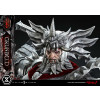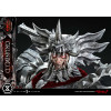 Towering above Guts, Grunbeld’s massive frame has been crafted at an imposing height of 107 cm. His raised warhammer, shield, and armor convey the weight of silvered steel, layered with dents and weathering to etch the scars of battle. Two head sculpts are included: one with a stern, determined expression, and another with a fearless grin, equipped with an LED unit. As though reveling in the duel with Guts, an inhuman light glows within his eyes. The deep crimson fabric cloak, with its elegant drape and lustrous sheen, enhances the noble presence that tempers Grunbeld’s rugged might.