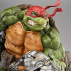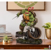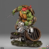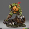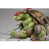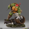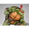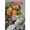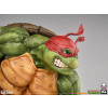 The Raphael Statue measures 21” tall and 21” wide as the rough-and-tumble turtle takes a battle stance on a sewer pipe base. Defeated Mouser robots lay in the muck beneath his feet while he holds his two sai in anticipation of more mechanical mayhem.