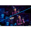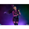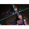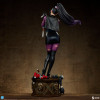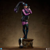 Inspired by the character’s appearance in The Joker War story arc, this fully sculpted comic book collectible depicts Punchline in a ripped purple bodysuit, black dress and corset bodice, knee-high black boots, and a small black cape. She wields her preferred weapon in her right hand while standing upon a circular pedestal resembling wooden baseboard and tarnished brass. The quarter scale DC statue includes two portraits: one neutral and enigmatic, the other devious, revealing the pleasure Punchline derives from her Super-Villain status. Each expression is accompanied by a long, high ponytail streaked by vivid blue.